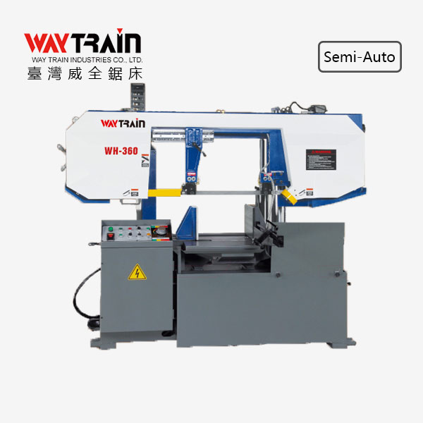WH-360A 雙柱式半自動帶鋸機 半自動系列 手動式鋸帶無段變速調整 數位鋸帶速度顯示表 排齒式油壓虎鉗夾緊裝置 油壓鋸帶張力 工作燈